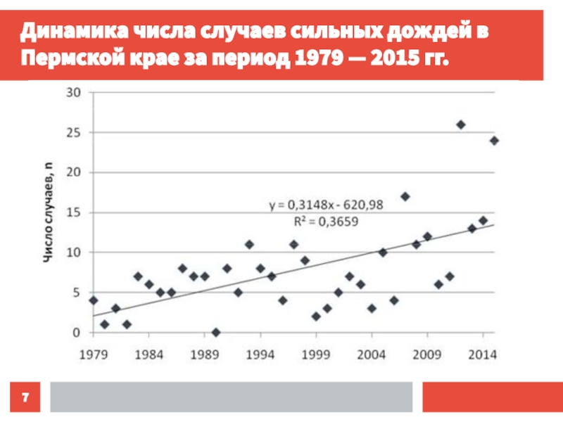 Слайд 7Динамика числа случаев сильных дождей в Пермской крае за период