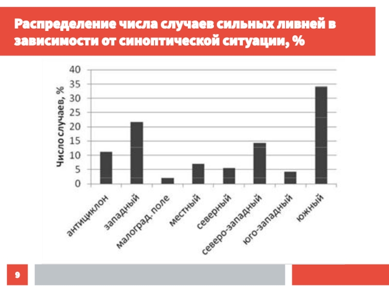Слайд 9Распределение числа случаев сильных ливней в зависимости от синоптической ситуации,