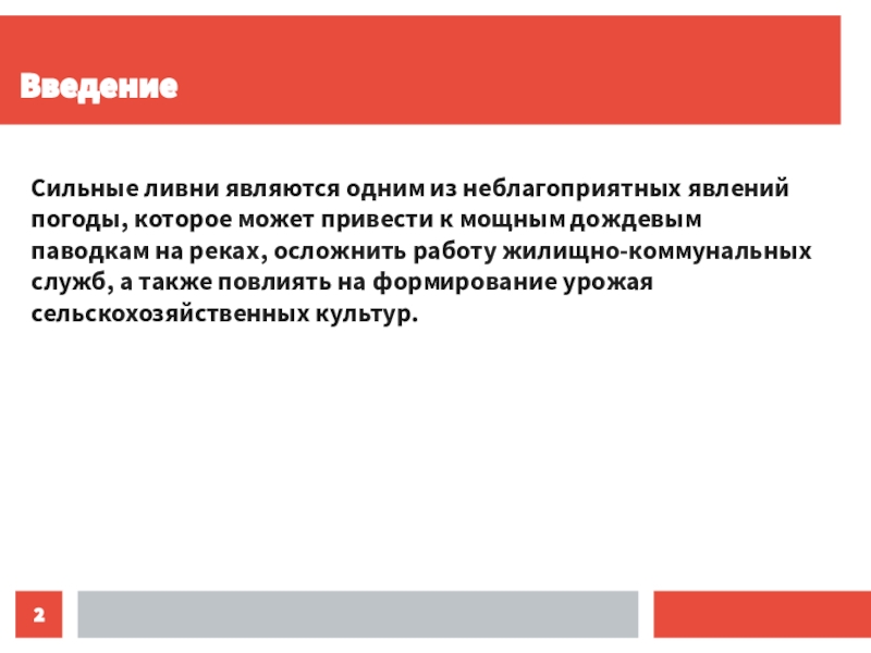 ВведениеСильные ливни являются одним из неблагоприятных явлений погоды, которое может привести к мощным дождевым паводкам на реках, осложнить работу жилищно-коммунальных служб, а также повлиять на формирование урожая сельскохозяйственных культур.