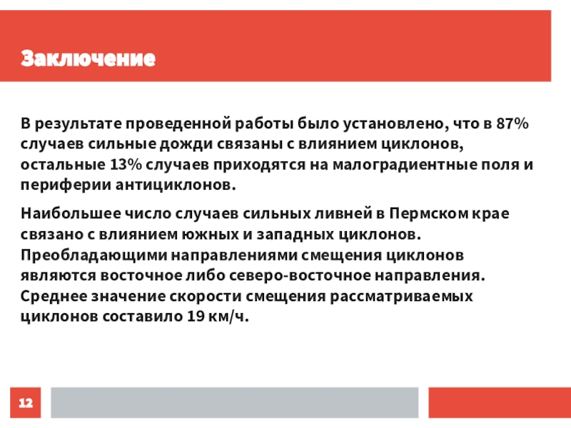 ЗаключениеВ результате проведенной работы было установлено, что в 87% случаев сильные дожди связаны с влиянием циклонов, остальные