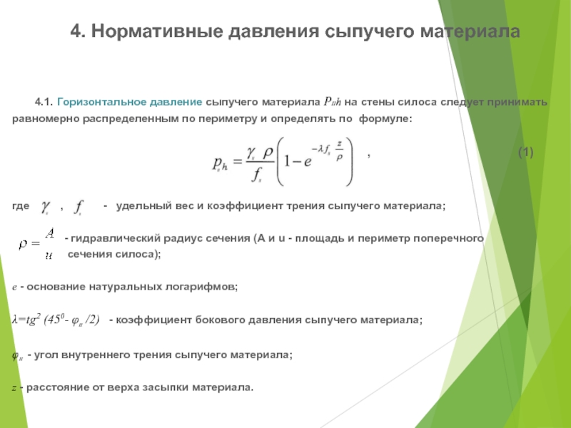 4.3. Полное (длительное и кратковременное) горизонтальное давление сыпучего материала на стены силосов следует определять по формуле: