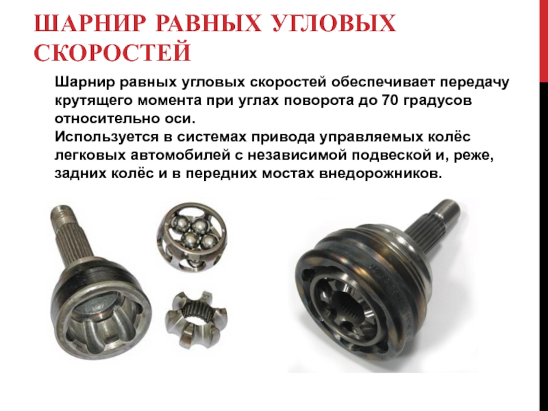 Шарнир равных угловых скоростейШарнир равных угловых скоростей обеспечивает передачу крутящего момента при углах поворота до 70 градусов