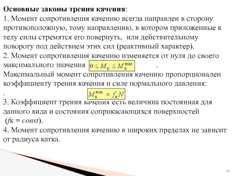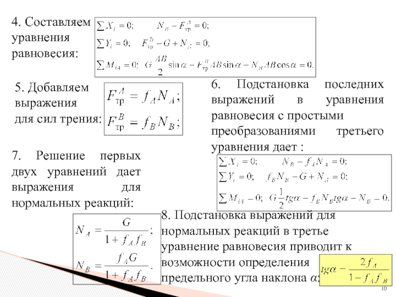 8. Подстановка выражений для нормальных реакций в третье уравнение равновесия приводит к возможности определения предельного угла наклона α: