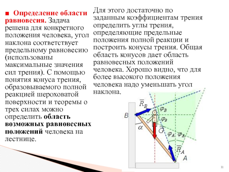 Для этого достаточно по заданным коэффициентам трения определить углы трения, определяющие предельные положения полной реакции и построить конусы трения. Общая область конусов дает область равновесных положений человека. Хорошо видно, что для более высокого положения человека надо уменьшать угол наклона.