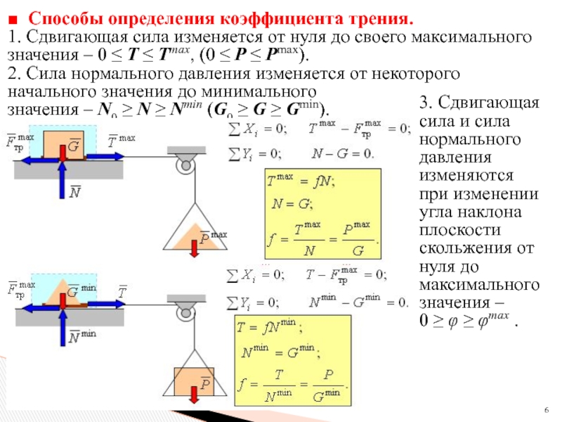 3. Сдвигающая сила и сила нормального давления изменяются при изменении угла наклона плоскости скольжения от нуля до
