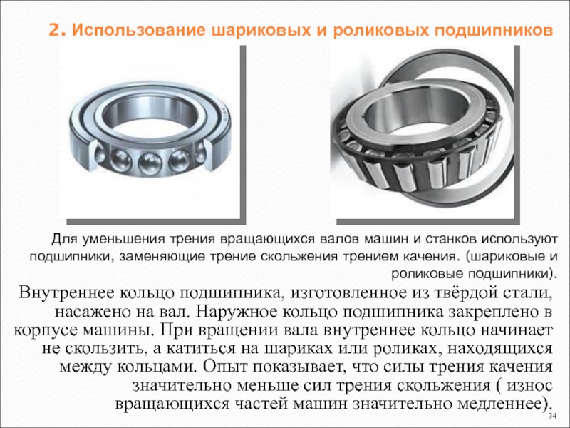 Внутреннее кольцо подшипника, изготовленное из твёрдой стали, насажено на вал. Наружное кольцо подшипника закреплено в корпусе машины. При вращении вала внутреннее кольцо начинает не скользить, а катиться на шариках или роликах, находящихся между кольцами. Опыт показывает, что силы трения качения значительно меньше сил трения скольжения ( износ вращающихся частей машин значительно медленнее).