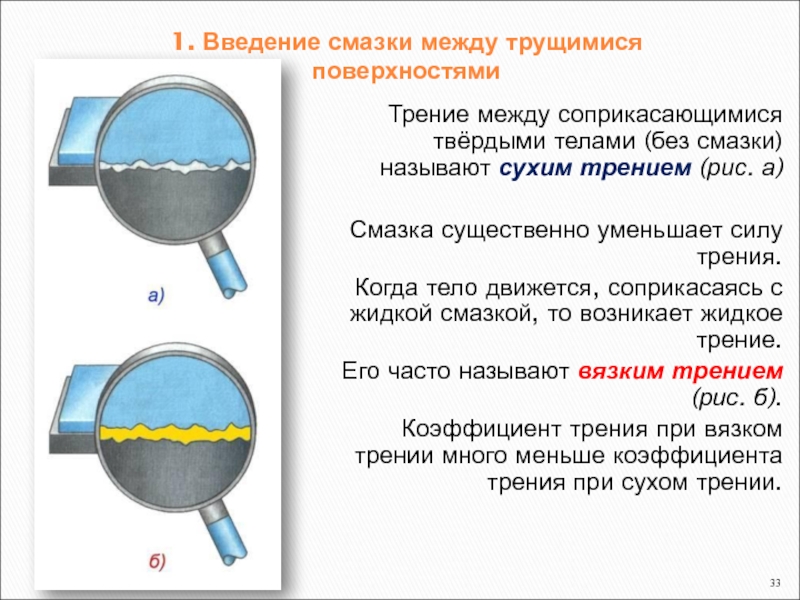 1. Введение смазки между трущимися поверхностями