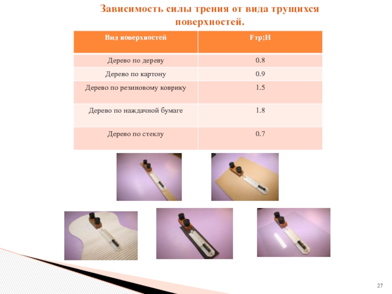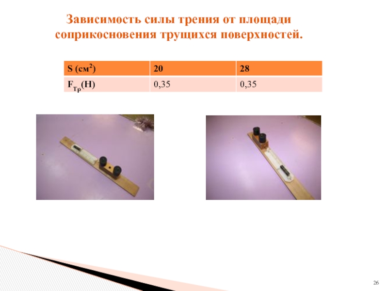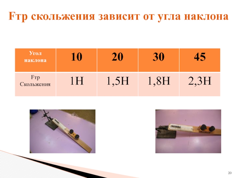 Но из опыта: сила трения не зависит от площади соприкосновения. Посмотрим на трибометр. Почему? Fтр определяется химией поверхностей и силой которая их сдавливает. Чем меньше площадь при той же величине силы сдавливания, тем больше давление на 1 мм кв. и больше атомов входят в химическое взаимодействие. Трибометр с двумя брусками. Сила возрасла в 2 раза! Противоречие? Т.е. для начала движения надо чтобы mgsin - μmgcos=mg(sin- μcos)=0 или μ =tg! Т.е. угол наклона доски в момент сползания бруска определяется только величиной μ, а не m. А почему нет зависимости от скорости? Так как короткодейтвие (химия) . Сила действует только на маленьком расстоянии. Т.е. факт химическая молекула создана! При малых скоростях с какой скоростью она создавалась не важно. Важно, что в один и тот же момент времени есть определенное количество молекул состоящих в химической связи. Химия в десять раз сильнее Ван-дер-Ваальсовых сил.