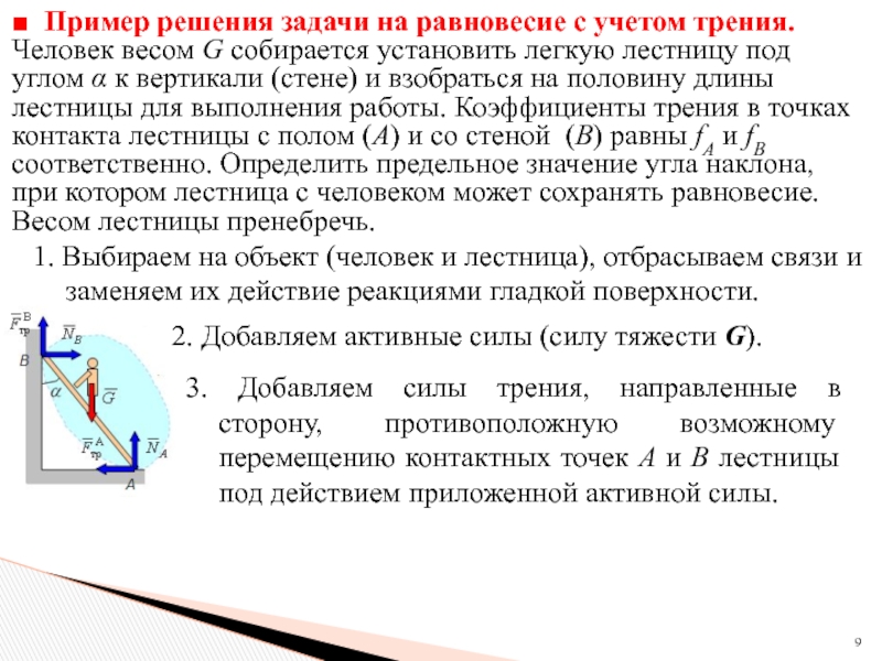 3. Добавляем силы трения, направленные в сторону, противоположную возможному перемещению контактных точек A и B лестницы под действием приложенной активной силы.
