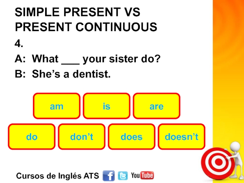 SIMPLE PRESENT VS PRESENT CONTINUOUS4. A: What ___ your sister do?B: She’s a dentist.isareamdodon’tdoesdoesn’t