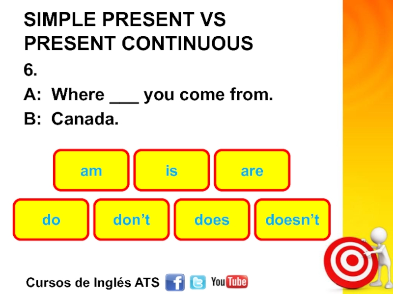 SIMPLE PRESENT VS PRESENT CONTINUOUS6.A: Where ___ you come from.B: Canada.isareamdodon’tdoesdoesn’t
