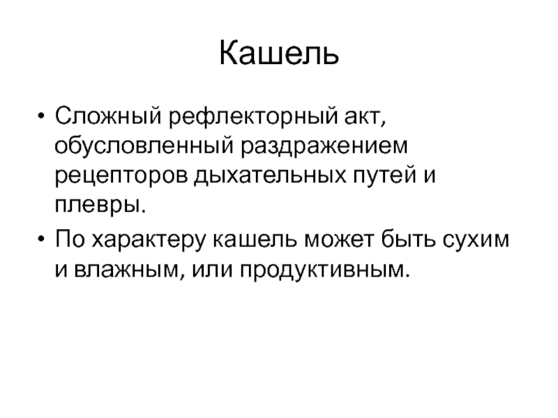 КашельСложный рефлекторный акт, обусловленный раздражением рецепторов дыхательных путей и плевры.По характеру кашель может быть сухим и влажным,