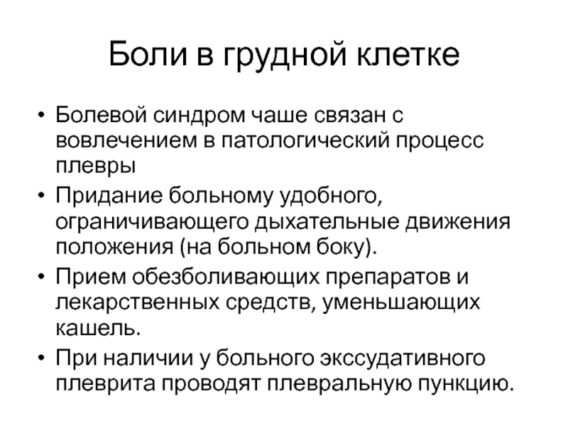 Боли в грудной клеткеБолевой синдром чаше связан с вовлечением в патологический процесс плеврыПридание больному удобного, ограничивающего дыхательные