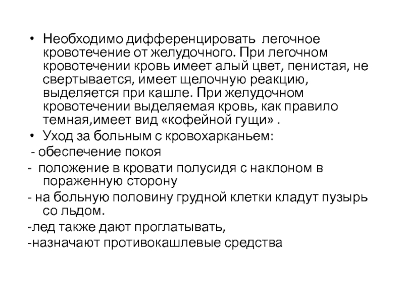 Слайд 8Необходимо дифференцировать легочное кровотечение от желудочного. При легочном кровотечении кровь