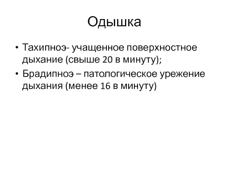 ОдышкаТахипноэ- учащенное поверхностное дыхание (свыше 20 в минуту);Брадипноэ – патологическое урежение дыхания (менее 16 в минуту)