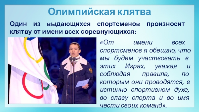 Один из выдающихся спортсменов произносит клятву от имени всех соревнующихся: