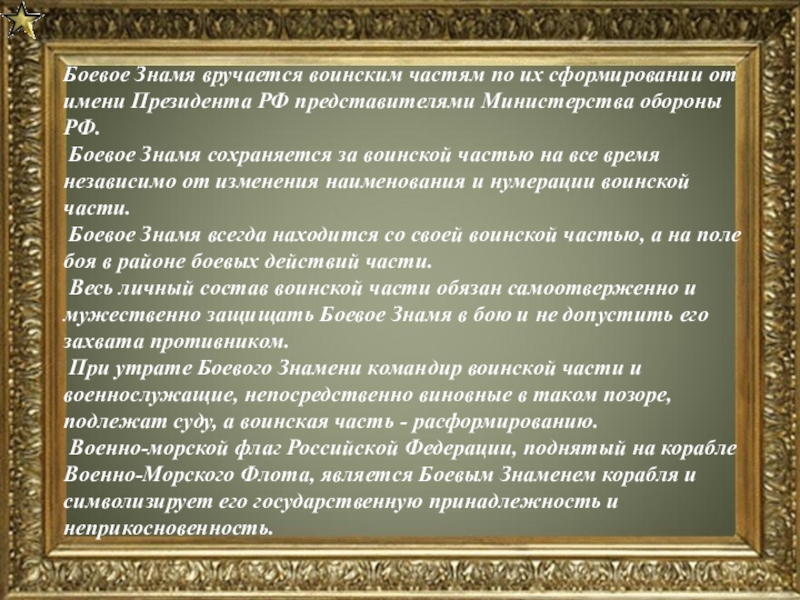 Слайд 22Боевое Знамя вручается воинским частям по их сформировании от имени