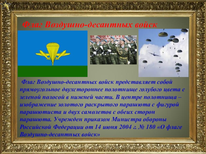 центре полотнища – изображение золотого раскрытого парашюта с фигурой парашютиста и двух самолетов с обеих сторон парашюта. Учрежден приказом Министра обороны Российской Федерации от 14 июня 2004 г. № 180 «О флаге Воздушно-десантных войск»