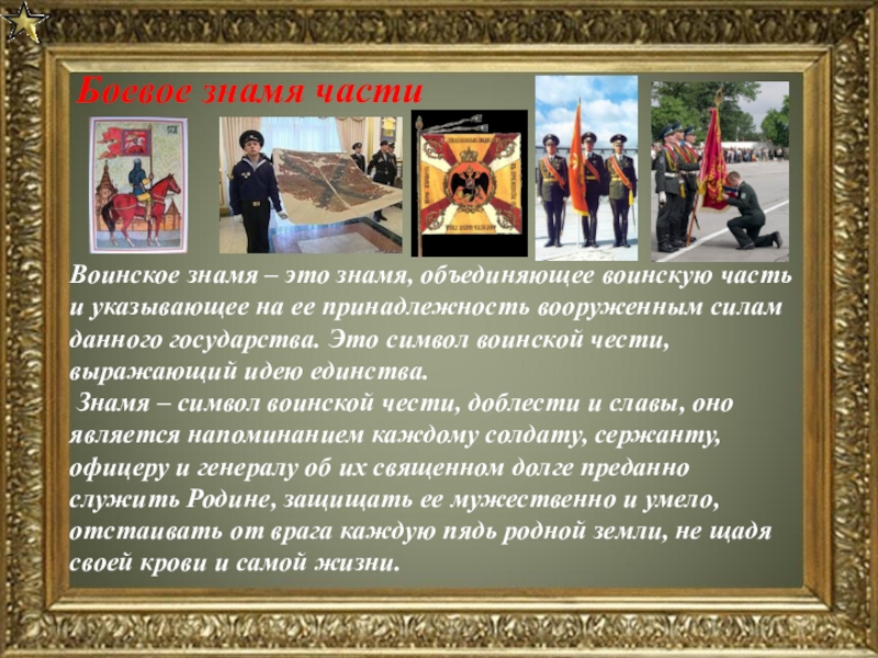 Слайд 20Воинское знамя – это знамя, объединяющее воинскую часть и указывающее