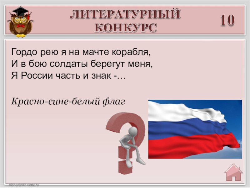 10203040501020304050102030405010203040501020304050БЛИЦ-ОПРОС ФЛАГГЛАВНАЯ ПЕСНЯГЕРБЛИТЕРАТУРНЫЙ КОНКУРССИМВОЛЫ РОССИИ
