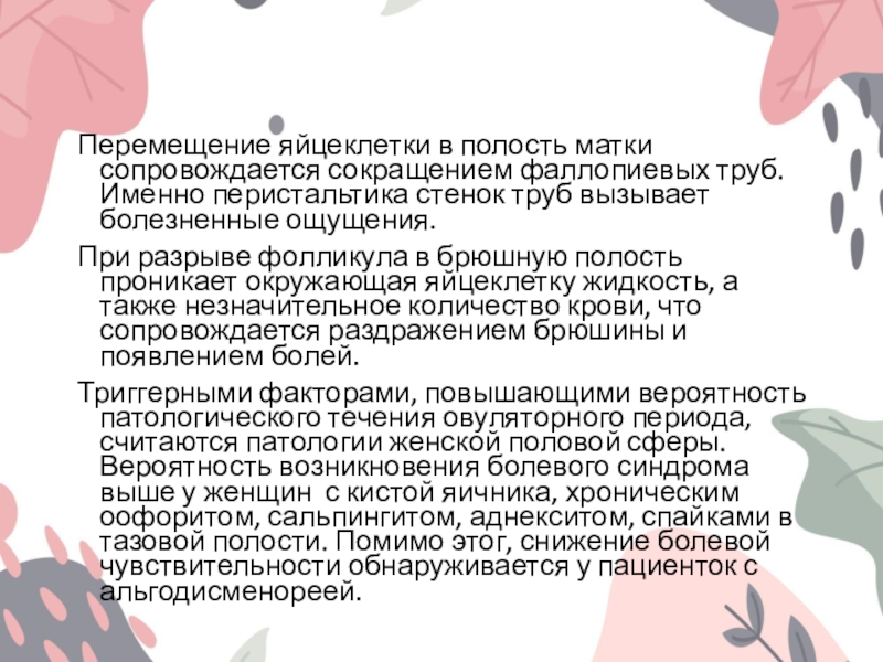 Триггерными факторами, повышающими вероятность патологического течения овуляторного периода, считаются патологии женской половой сферы. Вероятность возникновения болевого синдрома выше у женщин с кистой яичника, хроническим оофоритом, сальпингитом, аднекситом, спайками в тазовой полости. Помимо этог, снижение болевой чувствительности обнаруживается у пациенток с альгодисменореей.
