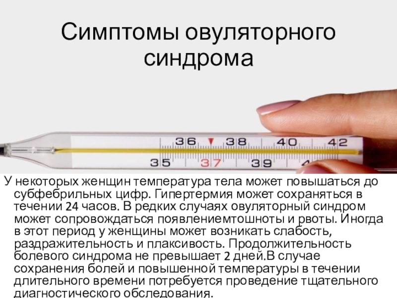 редких случаях овуляторный синдром может сопровождаться появлениемтошноты и рвоты. Иногда в этот период у женщины может возникать слабость, раздражительность и плаксивость. Продолжительность болевого синдрома не превышает 2 дней.В случае сохранения болей и повышенной температуры в течении длительного времени потребуется проведение тщательного диагностического обследования.