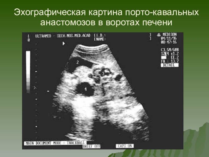 Слайд 26Эхографическая картина порто-кавальных анастомозов в воротах печени