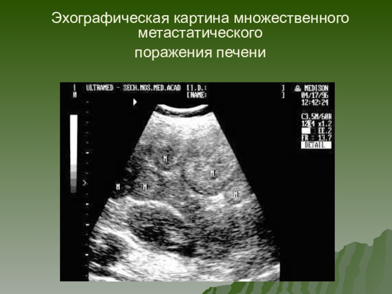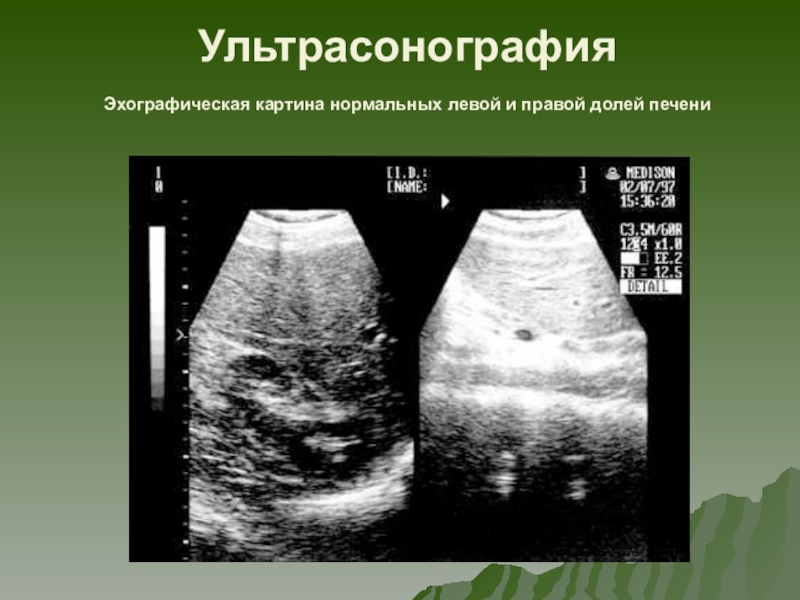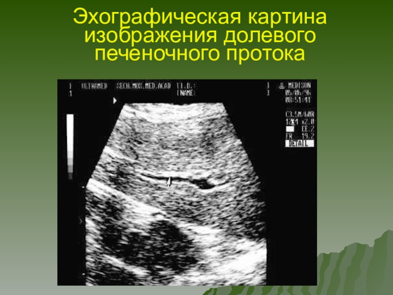 Слайд 28Эхографическая картина изображения долевого печеночного протока