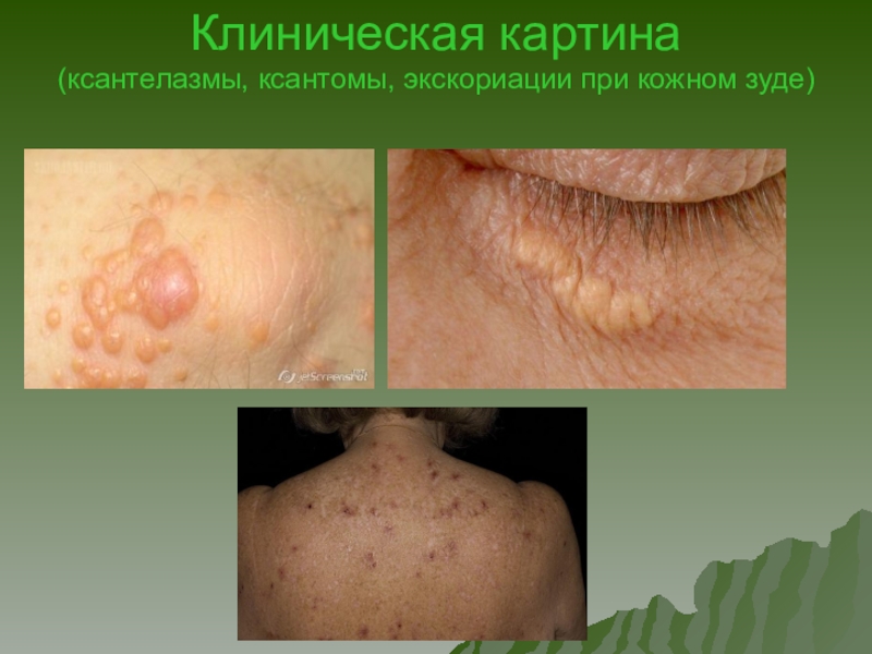 (ксантелазмы, ксантомы, экскориации при кожном зуде)