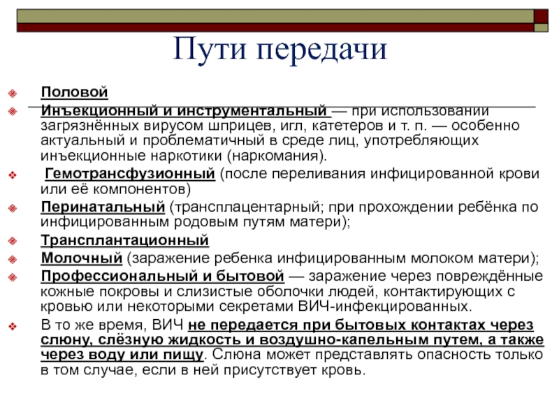 В то же время, ВИЧ не передается при бытовых контактах через слюну, слёзную жидкость и воздушно-капельным путем, а также через воду или пищу. Слюна может представлять опасность только в том случае, если в ней присутствует кровь.