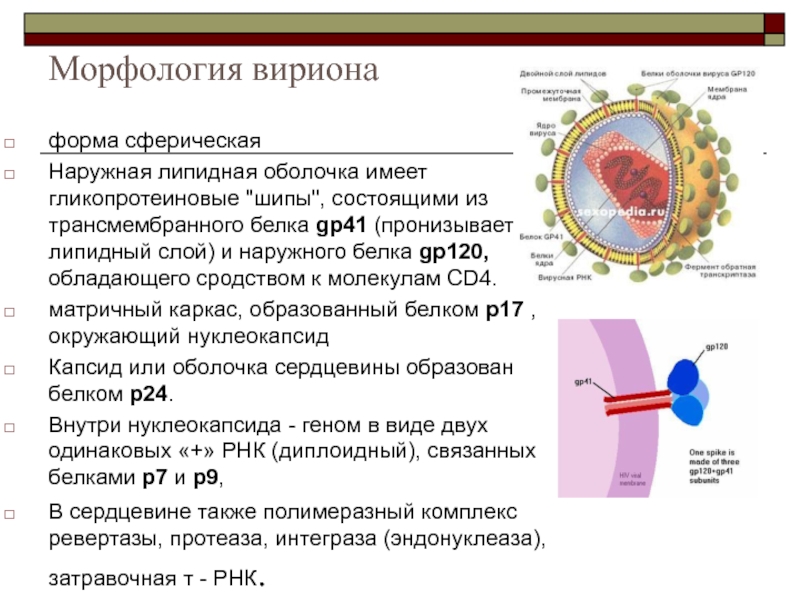 трансмембранного белка gp41 (пронизывает липидный слой) и наружного белка gp120,