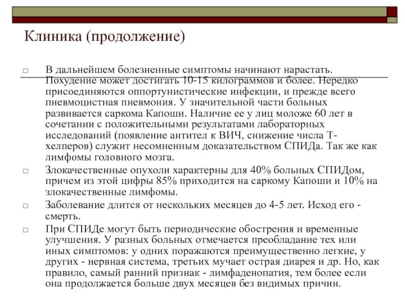 лимфатические узлы, печень и селезенка, снижается количество лимфоцитов в крови. Затем все проходит будто бы бесследно: инфицированный человек ни на что не жалуется. Однако через несколько месяцев (а чаще лет) у него медленно но неуклонно начинают обнаруживаться симптомы заболевания.
