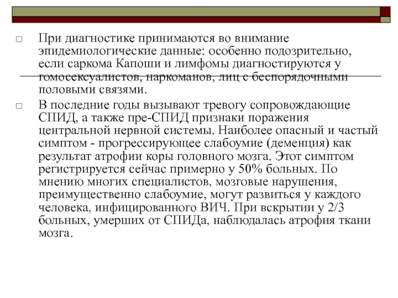 В последние годы вызывают тревогу сопровождающие СПИД, а также пре-СПИД признаки поражения центральной нервной системы. Наиболее опасный и частый симптом - прогрессирующее слабоумие (деменция) как результат атрофии коры головного мозга. Этот симптом регистрируется сейчас примерно у 50% больных. По мнению многих специалистов, мозговые нарушения, преимущественно слабоумие, могут развиться у каждого человека, инфицированного ВИЧ. При вскрытии у 2/3 больных, умерших от СПИДа, наблюдалась атрофия ткани мозга.