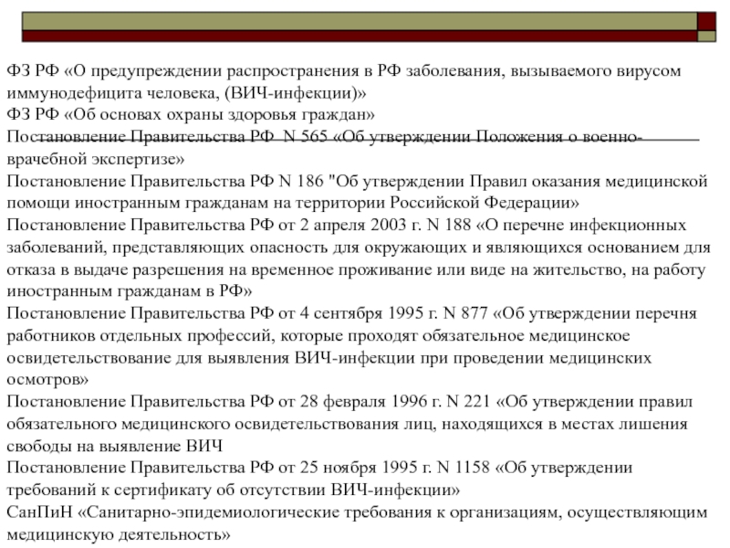 Постановление Правительства РФ от 2 апреля 2003 г. N 188 «О перечне инфекционных заболеваний, представляющих опасность для окружающих и являющихся основанием для отказа в выдаче разрешения на временное проживание или виде на жительство, на работу иностранным гражданам в РФ»