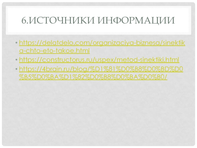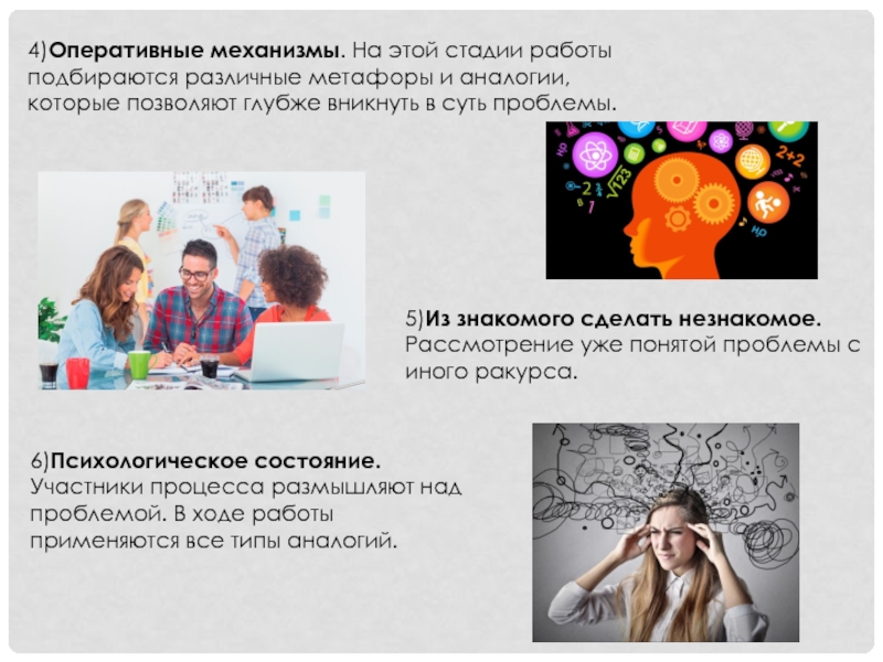 6)Психологическое состояние. Участники процесса размышляют над проблемой. В ходе работы применяются все типы аналогий.