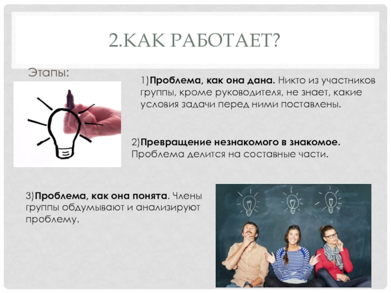 3)Проблема, как она понята. Члены группы обдумывают и анализируют проблему.