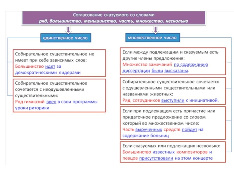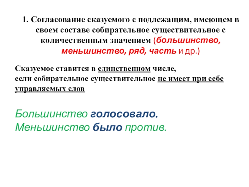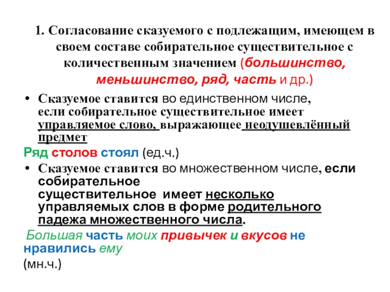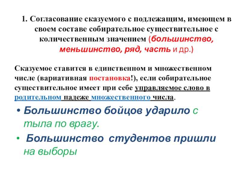 существительное с количественным значением (большинство, меньшинство, ряд, часть и др.). 2. Согласование сказуемого