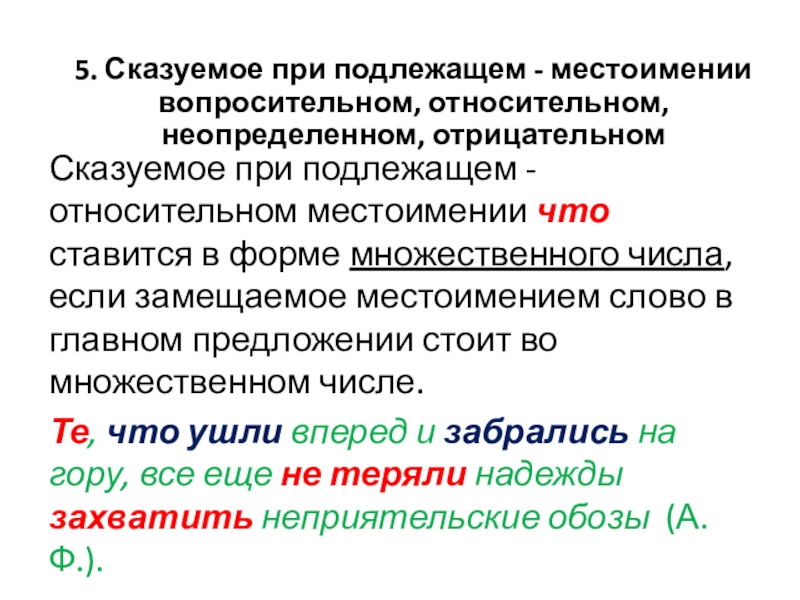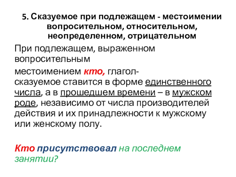 5. Сказуемое при подлежащем - местоимении вопросительном, относительном, неопределенном, отрицательном.