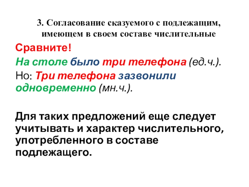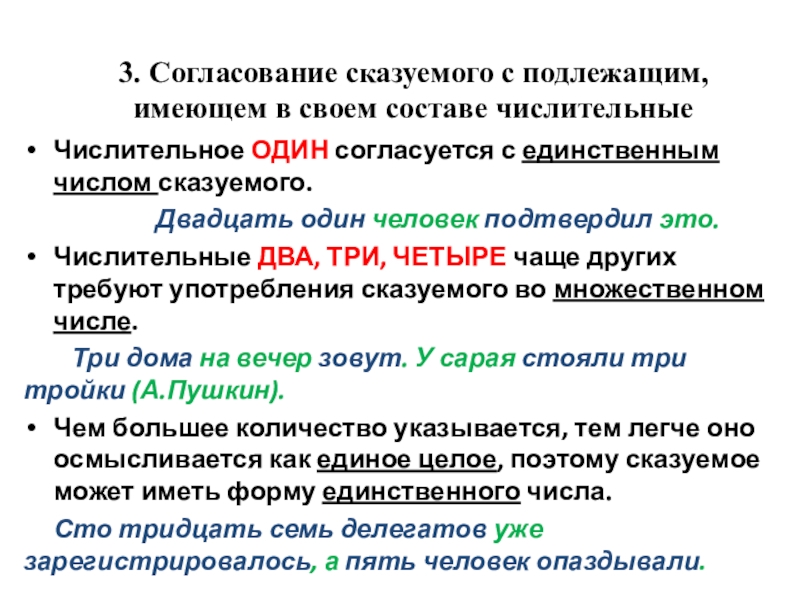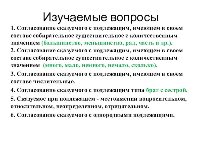 с подлежащим, имеющем в своем составе собирательное существительное с количественным значением (много, мало, немного, немало, сколько).3. Согласование сказуемого с подлежащим, имеющем в своем составе числительные.