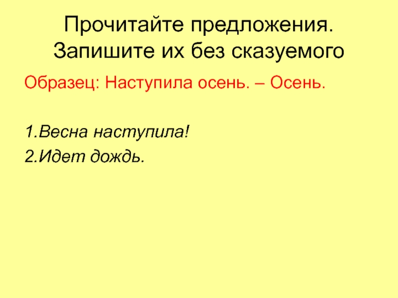Прочитайте предложения. Запишите их без сказуемогоОбразец: Наступила осень. – Осень.1.Весна наступила!2.Идет дождь.