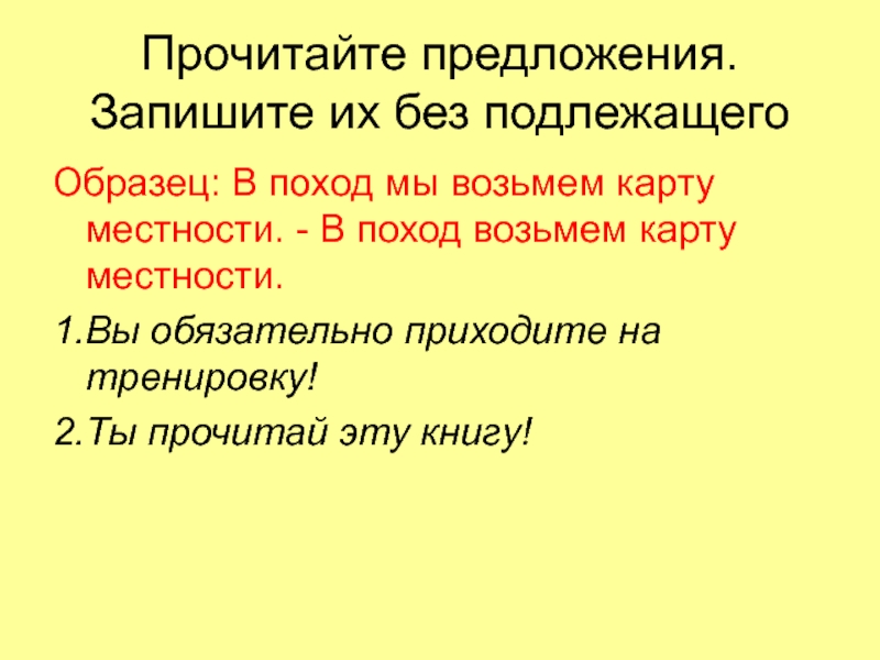 Прочитайте предложения. Запишите их без подлежащегоОбразец: В поход мы возьмем карту местности. - В поход возьмем карту