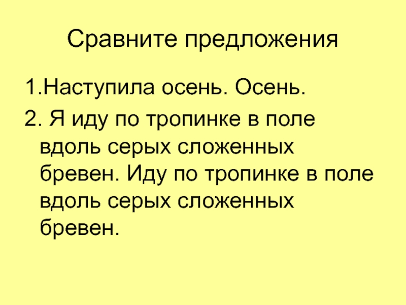 Сравните предложения1.Наступила осень. Осень.2. Я иду по тропинке в поле вдоль серых сложенных бревен. Иду по тропинке