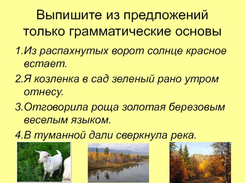 Выпишите из предложений только грамматические основы1.Из распахнутых ворот солнце красное встает.2.Я козленка в сад зеленый рано утром