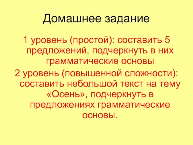 Домашнее задание1 уровень (простой): составить 5 предложений, подчеркнуть в них грамматические основы2 уровень (повышенной сложности): составить небольшой