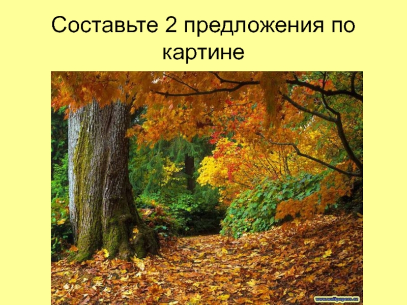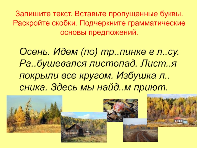 Осень. Идем (по) тр..пинке в л..су. Ра..бушевался листопад.