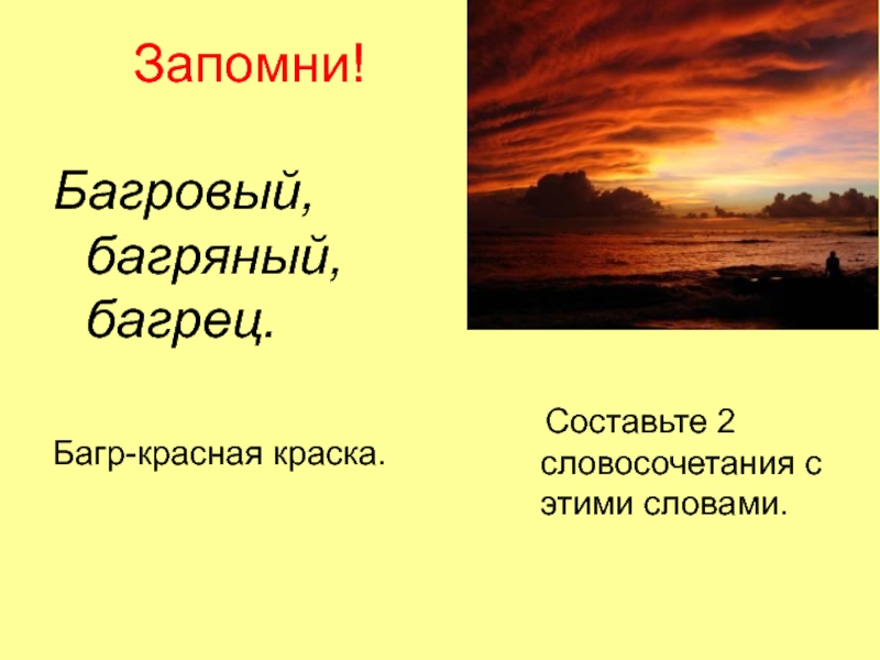 Запомни!Багровый, багряный, багрец.Багр-красная краска.  Составьте 2 словосочетания с этими словами.