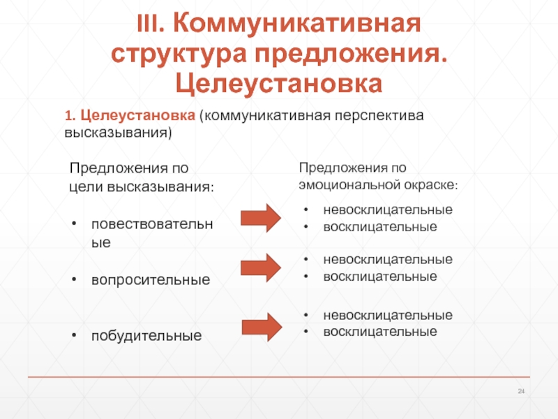 Слайд 24III. Коммуникативная структура предложения. Целеустановка