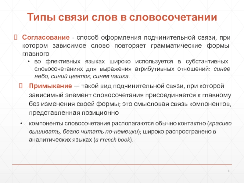 — способ оформления подчинительной связи, при котором главенствующий компонент словосочетания