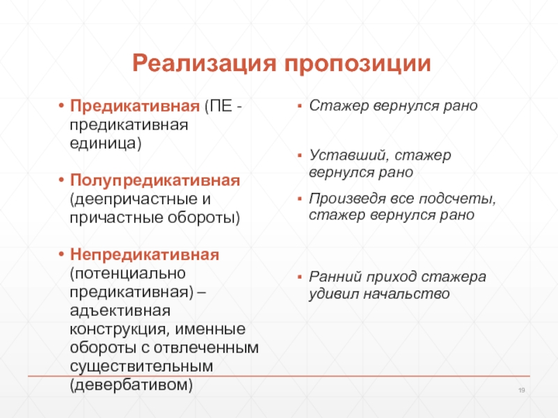 (потенциально предикативная) – адъективная конструкция, именные обороты с отвлеченным существительным
