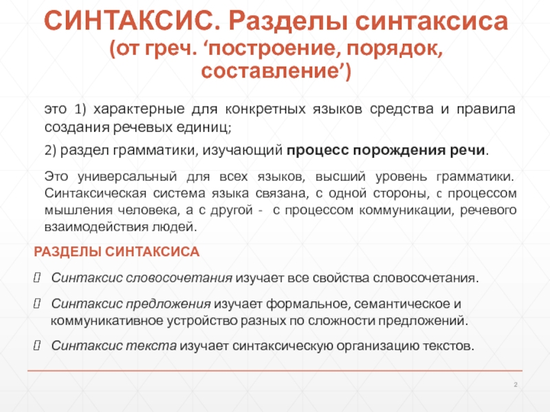 Слайд 2СИНТАКСИС. Разделы синтаксиса